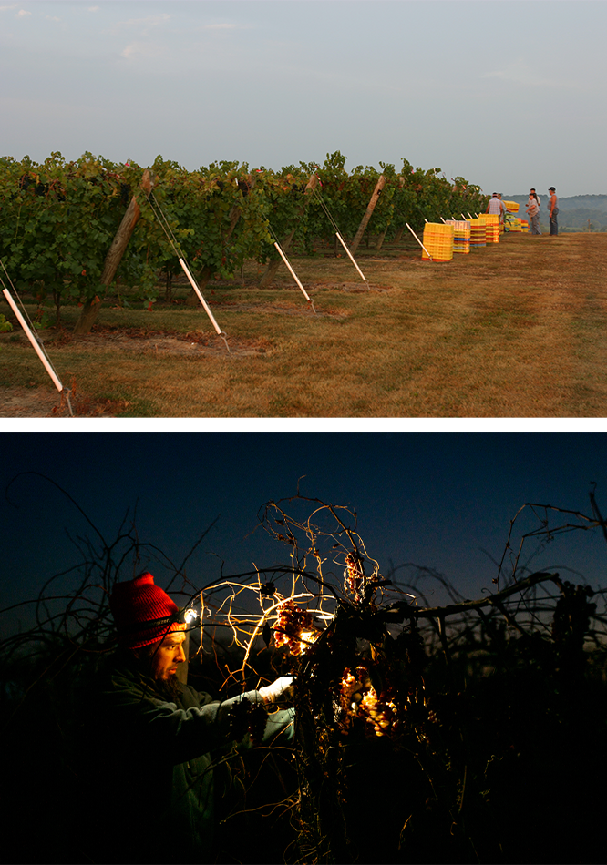 Maintaining a vineyard is no easy task. Bud break comes in spring, and requires maintenance throughout the year. Late frosts, heat, rain, and light can all impact the fruit on the vine, and while a certain amount is left to mother nature, measures can be taken to optimize the growth for the season. Once harvest rolls around, early autumn mornings become the heartbeat of the vineyard. For ice wine, the grapes are left on the vine and harvested by hand while frozen (usually before the sun is up). Once winter hits, the vines must be pruned back, and we wait for spring to come again.