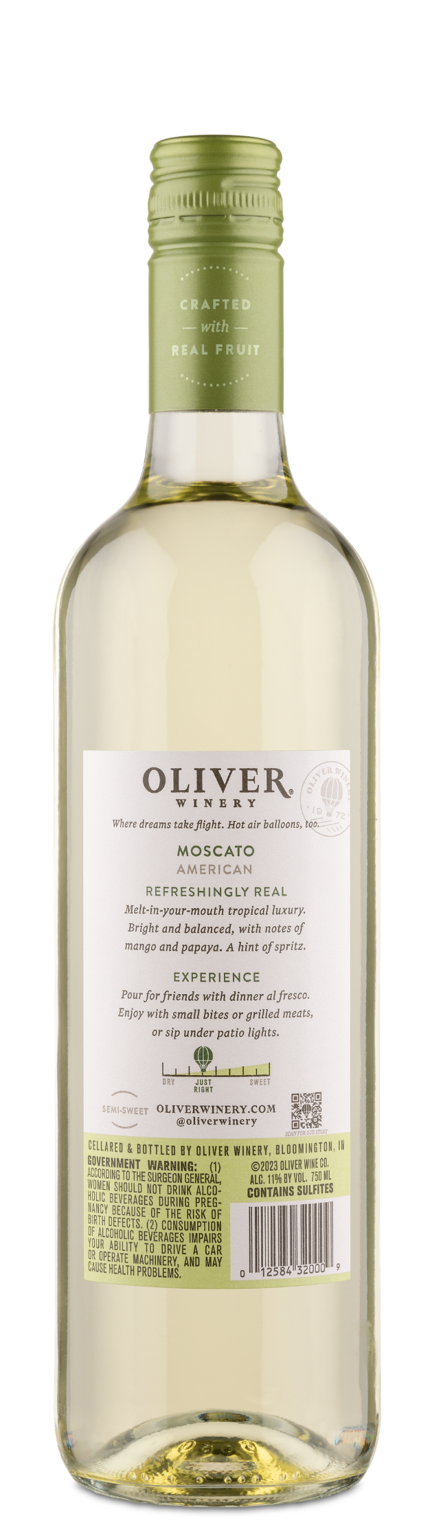 We source the best quality Moscato: Muscat Canelli and Muscat Alexander from the West Coast. Oliver Winery’s award-winning Moscato shows off the quality of this delicious fruit — fresh, full of exotic character, and lusciously sweet. A perfect match for dinner al fresco with grilled fish or chicken topped with black bean and mango salsa. Or pair with your favorite picnic foods, fresh fruit, mild cheeses.