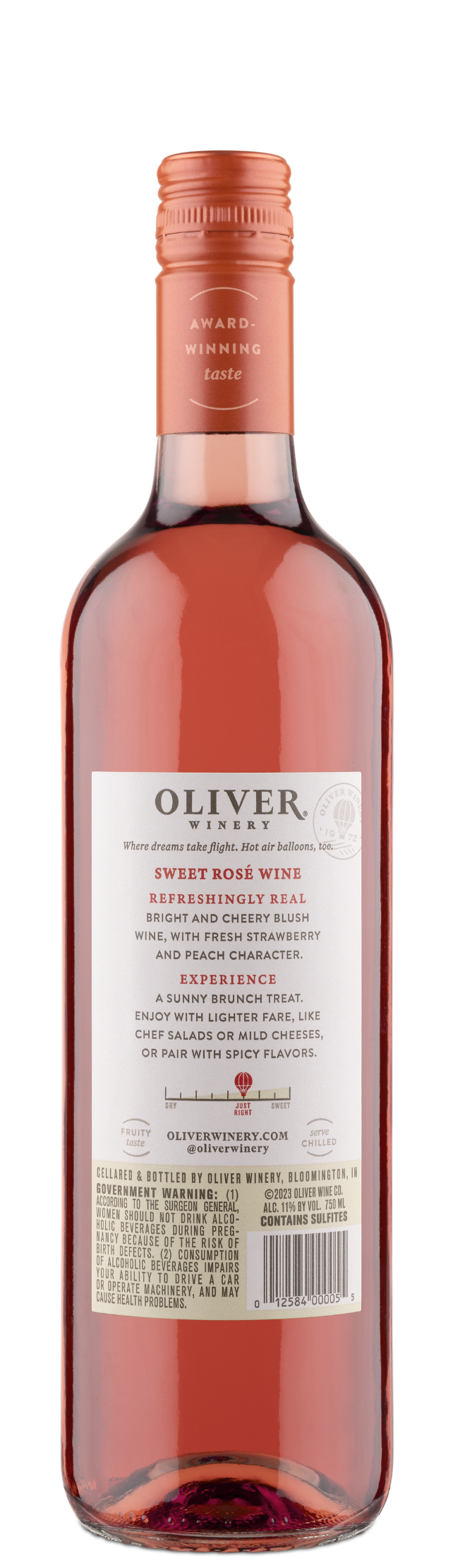 Refreshingly sweet for a rosé-style wine. Catawba grapes give our soft rosé wine fresh, bright strawberry flavor. Oliver Sweet Rosé is crisp and light.